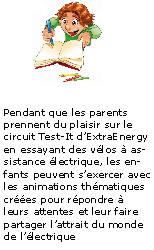 | Autour de l'essai d'un vélo électrique, qui n'intéresse finalement qu'une partie seulement des visiteurs, nous avons organisé une série d'animations pour dynamiser l'évènement et recueillir l'intérêt d'un plus grand nombre...